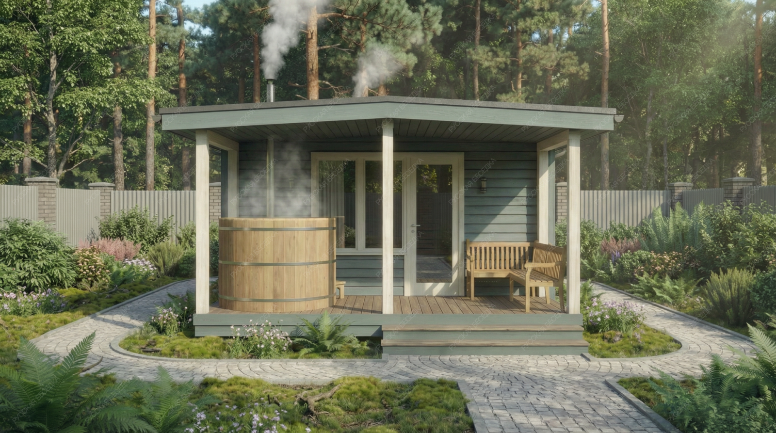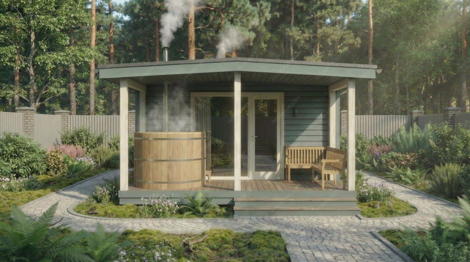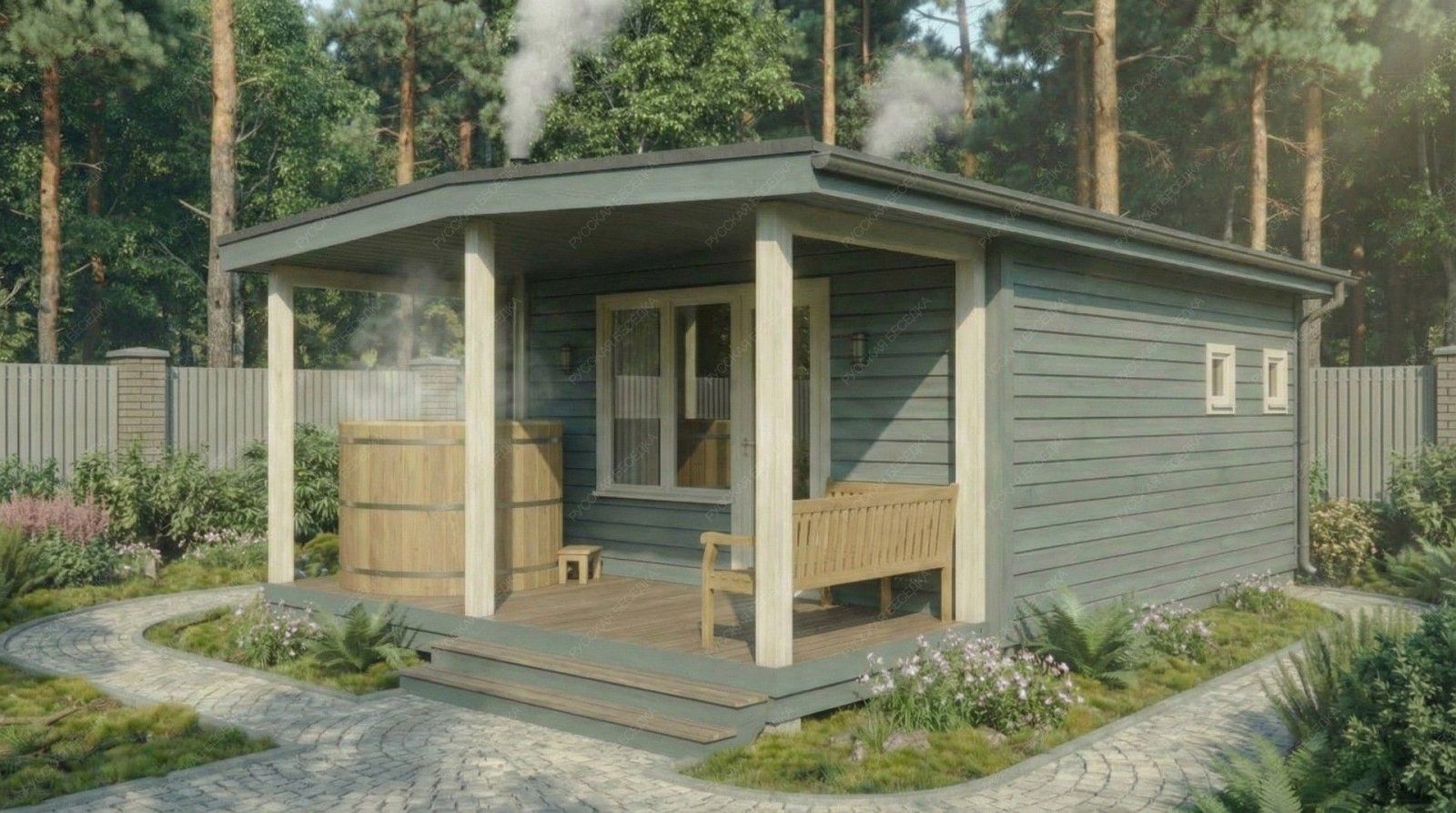 Баня «Сильвана» — это проект для тех, кто ценит простор и многофункциональность. Компоновка с открытой террасой и классической двускатной крышей предлагает сбалансированное пространство как для уединенного отдыха, так и для дружеских встреч. Просторная терраса площадью 9,74 м² становится логическим продолжением интерьера, идеальным местом для отдыха после банных процедур.  Ключевым преимуществом модели является её продуманная внутренняя организация. Просторная комната отдыха (16,02 м²) легко вместит большую компанию, создавая атмосферу теплого и гостеприимного клуба. Отдельная парная (5,62 м²) с окном-форточкой и изолированная помывочная (4,08 м²) обеспечивают гигиеничность и правильный банный микроклимат. Наличие собственного санузла (1,16 м²) добавляет бытового комфорта, повышая автономность строения. Общие габариты 4,8х6,5 м с террасой 4,8х2,1 м формируют солидное и представительное сооружение.  Качество исполнения, надежная двускатная конструкция крыши и натуральные материалы обеспечивают долговечность постройки и формируют ту самую аутентичную, целебную атмосферу, превращая баню «Сильвана» в полноценный центр релаксации и общения на вашем участке.