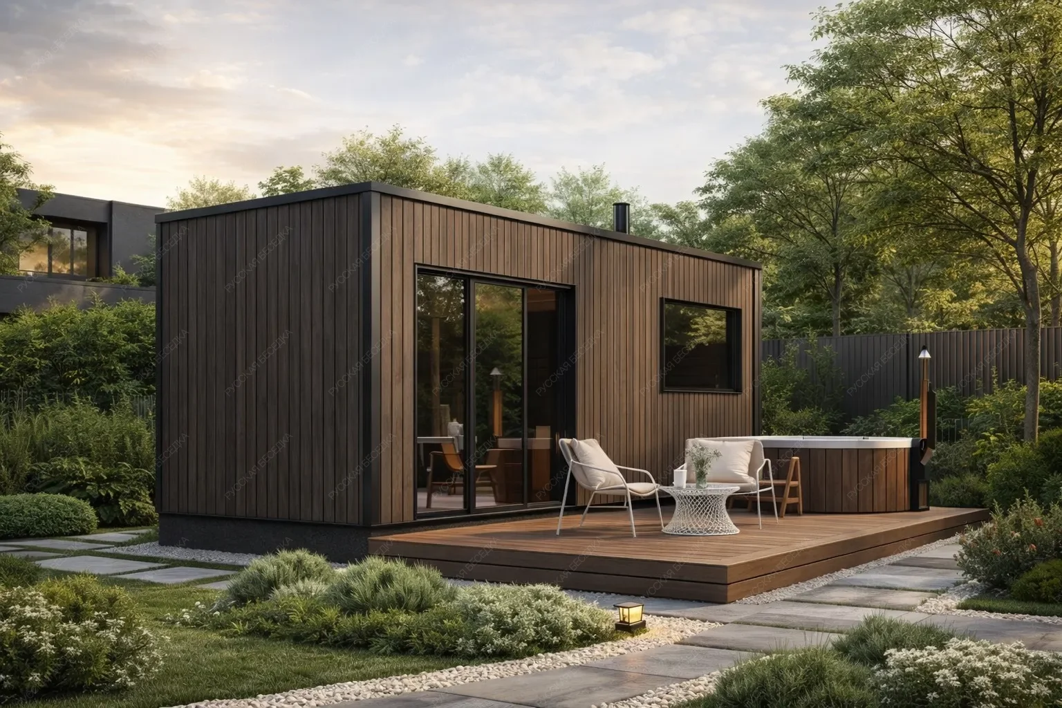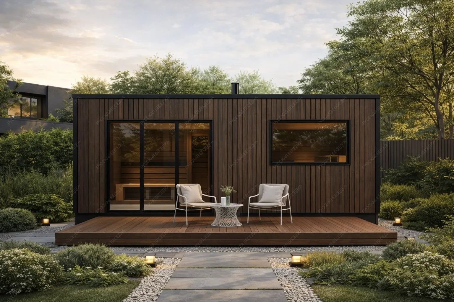 Мобильная баня «Тайга» с габаритами 6х2,4 метра демонстрирует эффективное использование вытянутой планировки площадью 14,4 кв.м. под односкатной крышей. Ее архитектура ориентирована на максимальную рациональность: линейное расположение помещений последовательно объединяет компактную парную, функциональную душевую и буферную зону, обеспечивая четкий и удобный маршрут движения. Значительным преимуществом модели является открытая терраса, компенсирующая ограниченную ширину сооружения и создающая комфортное внешнее пространство для отдыха после процедур. Односкатная крыша формирует современный динамичный силуэт, а мобильность конструкции позволяет быстро развернуть объект на любом подготовленном участке без капитального фундамента. Данное решение оптимально для небольших территорий, предлагая все базовые функции полноценной бани в лаконичном и технологичном исполнении.