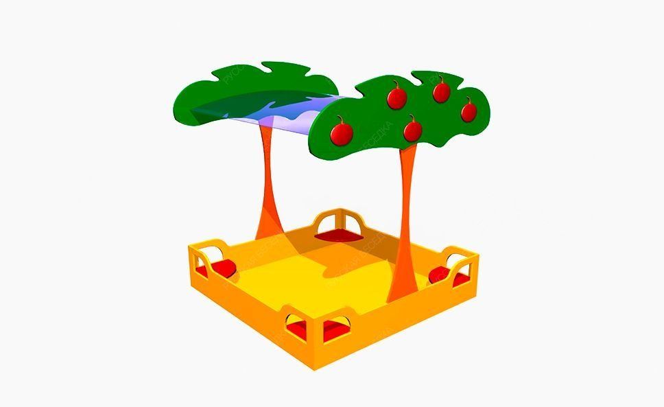 Детская песочница «Яблоня» объединяет в себе возможности песочницы и защитные функции грибков-навесов. Крыша этой песочницы изготовлена из поликарбоната и закрыта по краям декоративными фанерными накладками, изображающими крону яблони. Стойки, поддерживающие конструкцию крыши, слегка изогнуты и имитируют ствол дерева. Игры с песком служат совершенствованию мелкой моторики рук и координации движений ребенка, способствуют развитию фантазии и объемному видению мира.