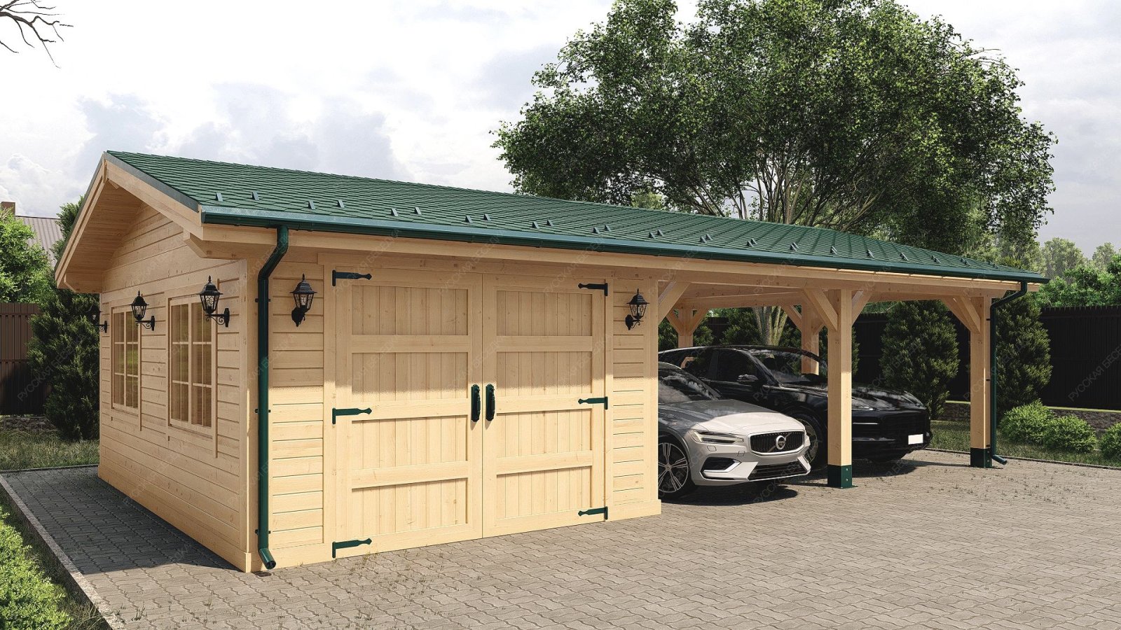 Двухскатный гараж с навесом, въезд сбоку Гаврилково