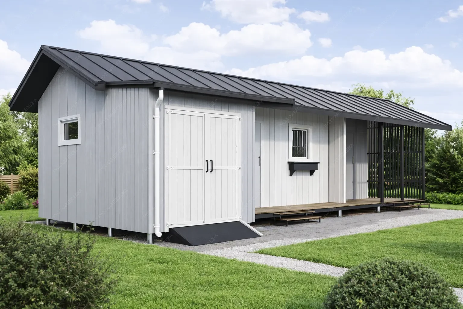 Конструкция изготовлена из хвойных пород древесины (ель, сосна). Материал — массив сухой строганый камерной сушки. *возможна замена на клееный брус