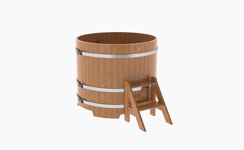 Купель круглая из дуба d=1,17 Изготовлена из дуба, имеет размер - в диаметре - 1,17 метра, высота - 1,0 метр. Поверхность купели обработана специальным, особым защитным покрытием из полиуретана – придающий поверхности купели – водостойкость – износостойкость, обладающим эластичностью. На ощупь – поверхность купели имеет приятную гладкую текстуру. Такая защита является абсолютно экологически безопасной что подтверждено государственным гигиеническим сертификатом. В случае, когда купель нужно установить на открытом воздухе – поверхность купели обрабатывае тся специальным покрытием с защитой от ультрафиолетовых лучей. В некоторых случаях, например - когда габариты купели превышают размеры дверных проемов в помещениях, доставка купели осуществляется в разобранном виде –в составе из четырех отдельных сегментов и донышка, сборка осуществляется на месте - стоимость сборки купели - уточняйте у менеджеров.