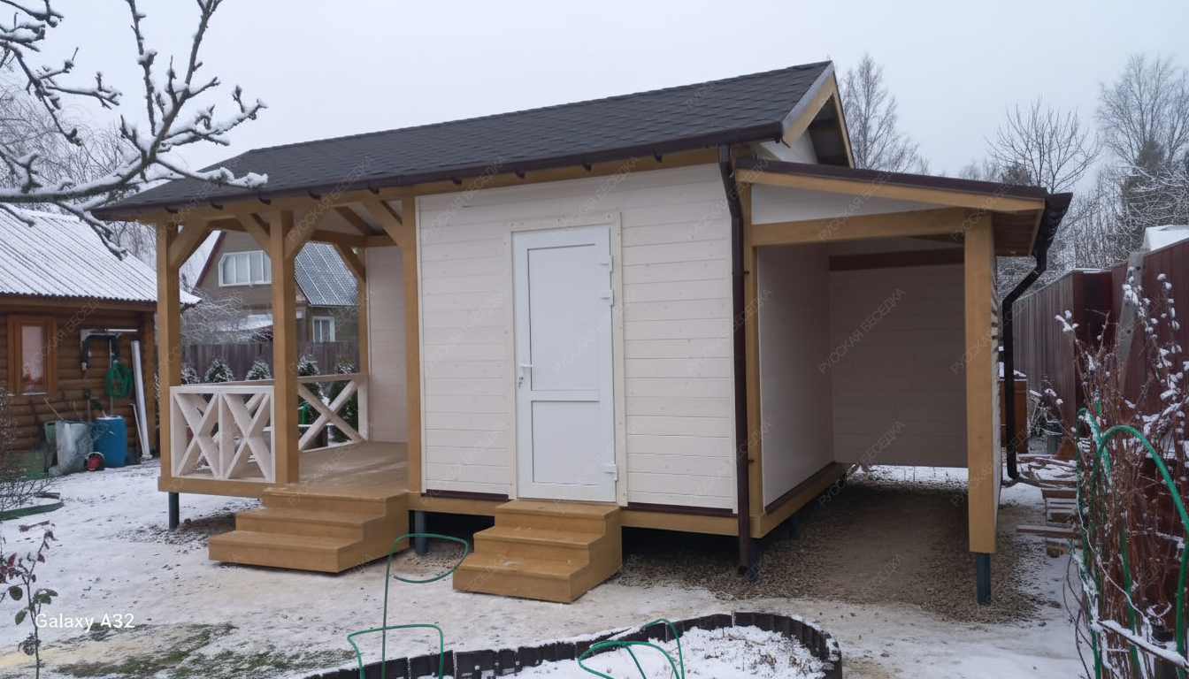 Имитация бруса 16×135 мм внутри, имитация бруса 21×135 мм снаружи.