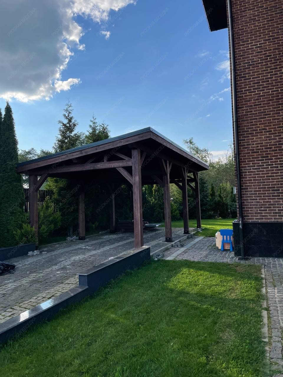 Для производства всех элементов навеса используется только отборная древесина без малейших дефектов, прошедшая камерную сушку и пропитку антисептиками. Навесу после защитной обработки лаком не страшны высокая влажность, а значит, можно быть уверенным, что дерево не растрескается, не разбухнет и не покоробится.