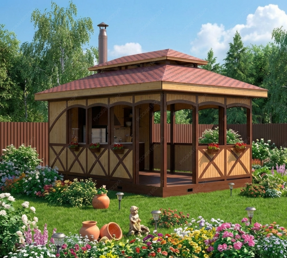 Беседка выполненная из лучших пород древесины, прослужит долгие годы и не потребует особого ухода и обслуживания. Специальные лакокрасочные материалы которые мы используем, предотвратят старение, гниение и заражение грибком конструкции кухни. Используемая огнебиозащита образует полупрозрачное полуматовое покрытие, стойкое к влаге, УФ-излучению, перепадам температуры и другим атмосферным воздействиям.