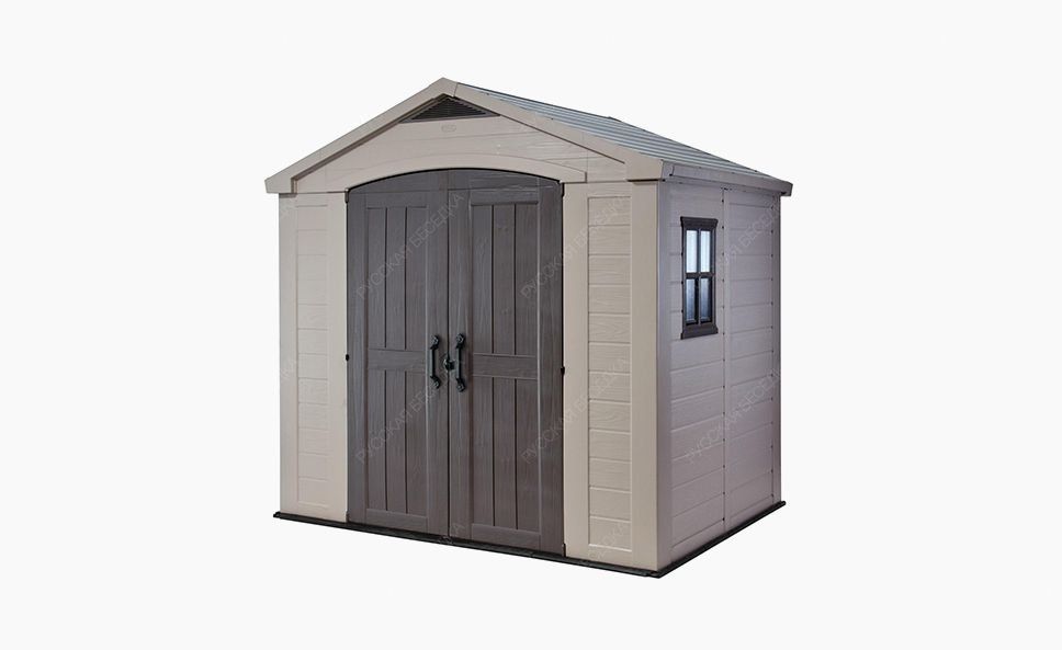 Функциональный домик Factor 8x6 будет радовать даже самых требовательных пользователей. Стальная усиленная конструкция, широкие двустворчатые двери, дополнительное освещение через встроенное окно - это несомненные преимущества этого продукта. Пространство домика можно организовать наиболее оптимальным способом, благодаря возможности установки полок и вешалок. Изготовлен из высококачественного пластика, не требует технического обслуживания, не подвержен процессам коррозии, отслаивания покрытия или гниения материала. Особенности сарая: Прочные двойные стенки. Износостойкая крыша. Не требует ремонта, покраски и другого обслуживания. Сверхпрочные панели пола выдерживают большой вес (газонокосилку, мототехнику). Предусмотрена возможность повесить навесной замок. Встроенные вентиляционные отверстия. Преимущества: Быстрая сборка без мусора и грязи. Панели легко собираются благодаря готовым пазам и выступам. За 2-3 часа два человека полностью соберут сарай. Компактная упаковка. Габариты комплекта коробок не более 2х1,2х0,5 м. Мобильность конструкции. Возможность перенести на новое место. Универсальность применения. Для уличной мебели, хозинвентаря или как гараж для средств малой механизации. Всепогодный. Может эксплуатироваться при температуре от -40 до +70 С. Варианты использования:  Садовый домик для коммуникационных систем. Хозблок для автономной электростанции, генератора, компрессора, газового баллона. Сарай для хранение садовой мебели. Хозяйственный блок для хранения инвентаря для уборки, чистки бассейна, строительных материалов. Гараж для мототехники, квадрациклов, велосипедов, самокатов, санок, снегокатов, лыж.