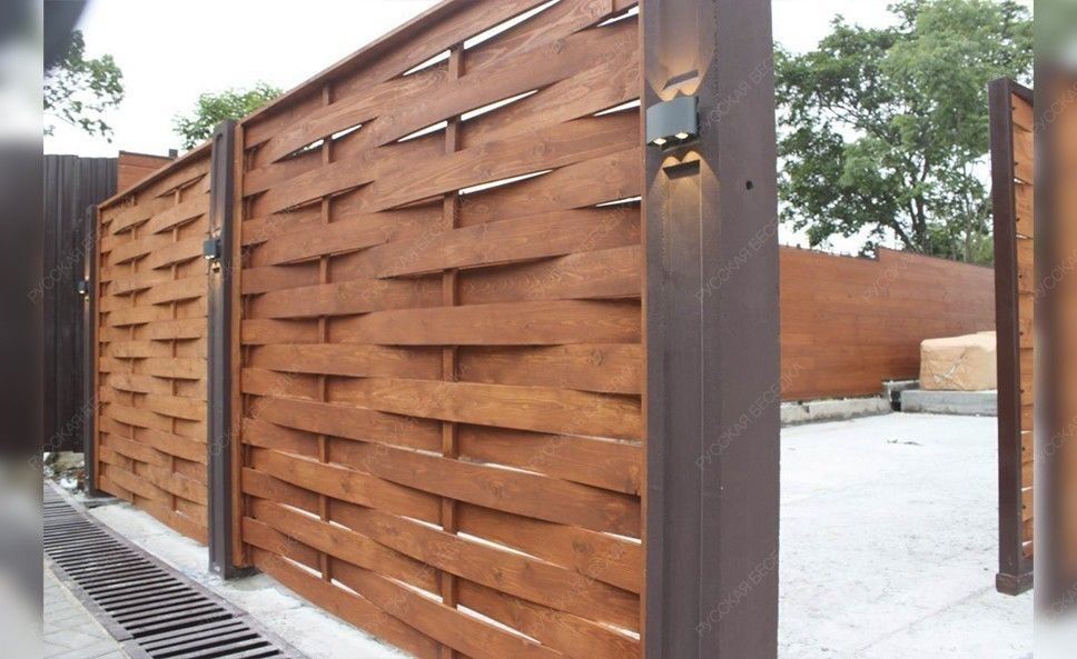 Профильная труба 40х20х2 мм, окрашенная в 2 слоя Обработка: Tikkurila METALLISTA PRIMER (грунт), краска Tikkurila Metallista в цвет заборной доски. Или деревянный каркас из строганного бруска 50х50