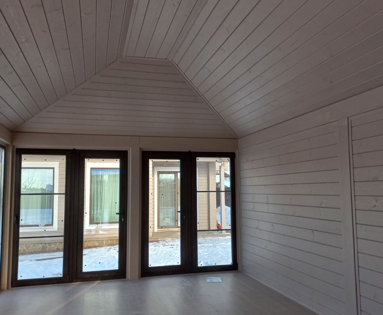 Раздвижная алюминиевая система. Окна в бронировочной пленке. Цвет пластика белый или коричневый.