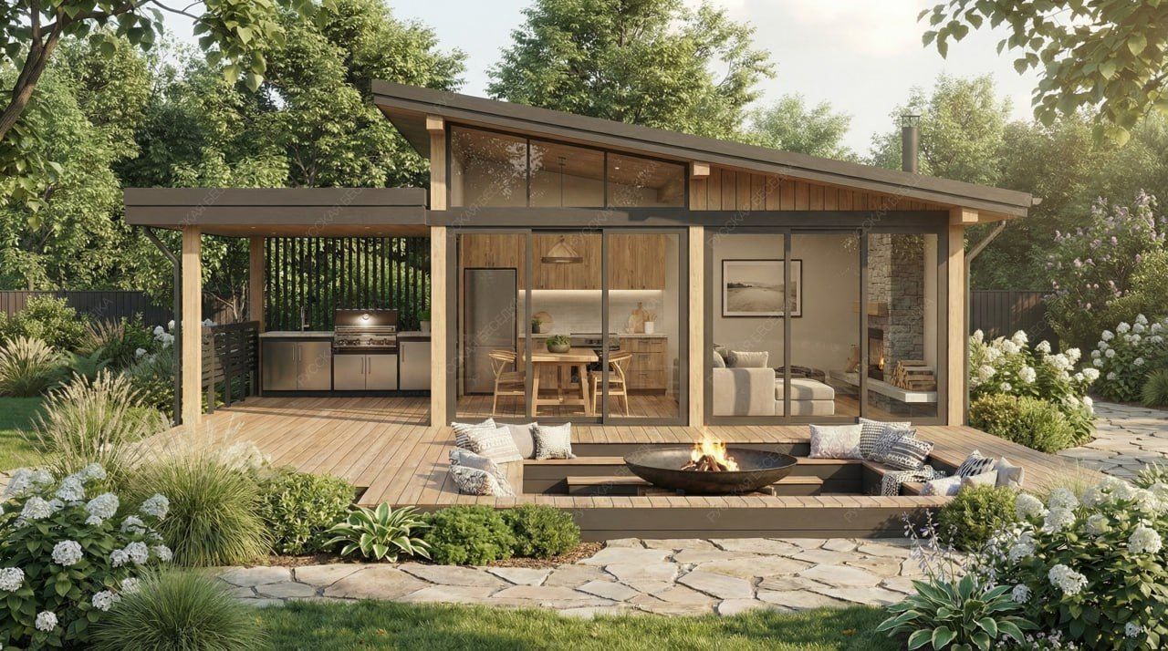 Отличительной особенностью зон отдыха является их многофункциональность: вы можете готовить на просторной веранде, организовать обеденную зону под навесом или в закрытой части, расположить летний кинотеатр под открытым небом, интегрировать в конструктив террасы бассейн или детскую площадку.